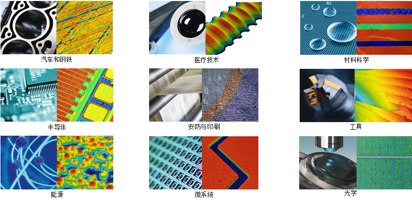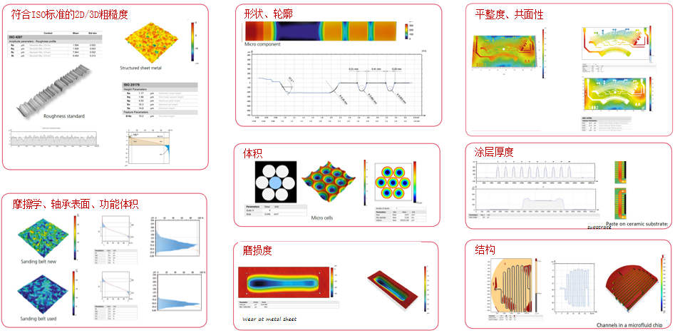 相关应用:对材料/产品/工件做表面非接触式三维形貌扫描,分析2D/3D表面形貌、轮廓几何尺寸(长度、宽度、深度、角度、面积、体积等)、表面粗糙度、平整度、翘曲、曲率、面形精度、摩擦磨损及腐蚀等参数指标。