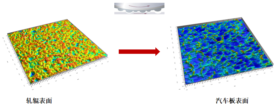 随着各汽车车厂涂装工艺逐步更新,汽车车身涂装后需具有更高的鲜映性、光泽度和成像清晰度。这不仅对汽车厂的涂漆工艺有更高的要求,同时需要板材厂提供的板材表面状态控制在合适的范围。而汽车板表面的粗糙程度在最开始的时候是通过轧辊在轧制过程中转印形成的,所以说有效测量轧辊表面粗糙度信息(Ra、Rz、Rpc、Wa、Sa、Sz、表面颗粒度和磨损等),并及时反馈到控制中心,可为研究并制定汽车板粗糙度控制措施提供准确的数据,从而保证汽车厂对良好外观的要求。同时,根据具体粗糙度要求可对压下率、轧辊服役周期、轧制力以及轧制顺序等进行适当的调整,从而提高生产效率。