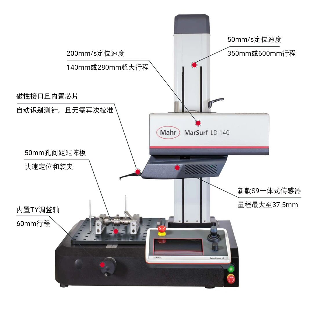 新款 LD 采用 MarSurf Family-B 平台设计,搭载新研发的 S9 粗糙度轮廓一体式测针系统,可高精度同步测量粗糙度与轮廓数据,系统噪音 Rz 值低至 20nm。配备 250mm 长测杆,量程最大 37.5mm,传感器支持上下测量,双向测针测杆可分析螺纹直径等参数。测量台内置 60mm TY 轴,提供手动 / 电动模式,电动 TY 轴可实现自动化找最高点或校准。